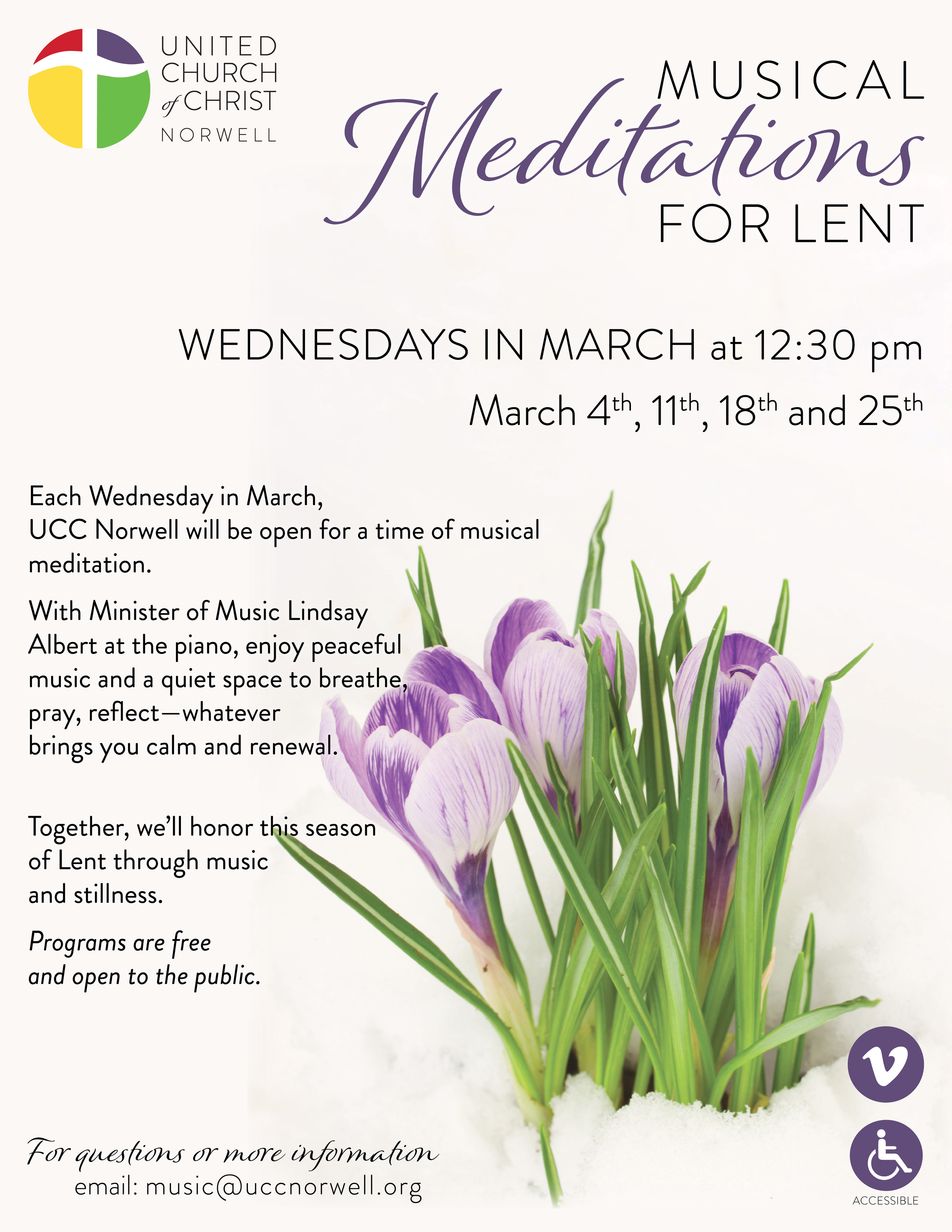 Each Wednesday in March, UCC Norwell will be open for a time of musical meditation. With Minister of Music Lindsay Albert at the piano, enjoy peaceful music and a quiet space to breathe, pray, reflect—whatever brings you calm and renewal. Together, we’ll honor the Lenten season through stillness and reflection.